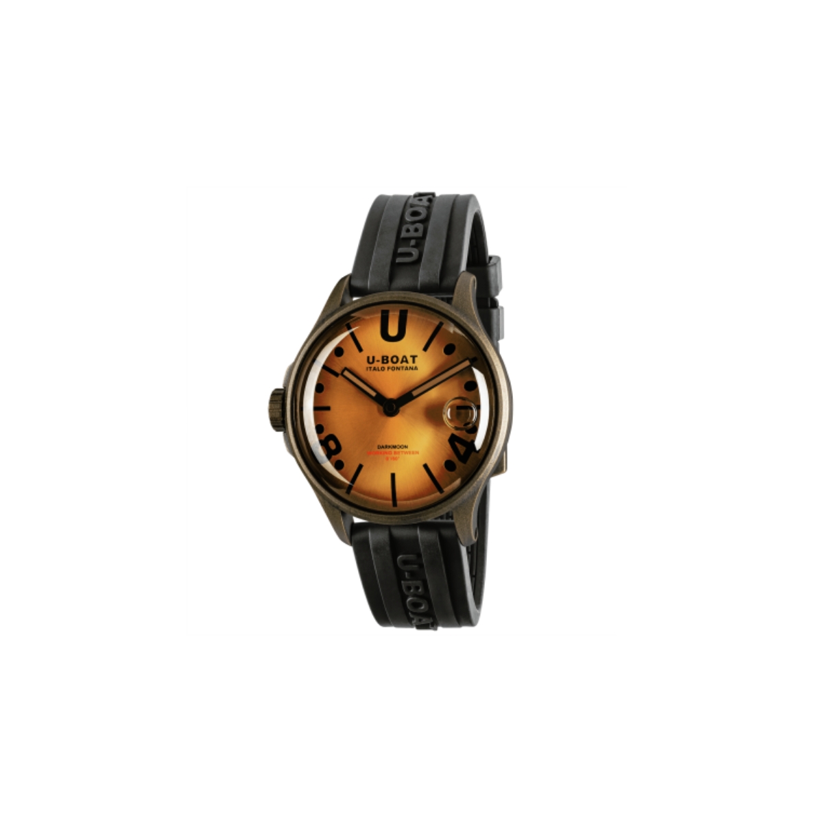 made of AISI 316L stainless steel with an aged PVD bronze treatment, fully filled with a special oil that enhances the dial, creating the illusion of glass absence, resulting in a deeper colour and improved readability. Visible air bubble on the dial to compensate for temperature variations. Distinctive left-side crown guard. 40 mm diameter.