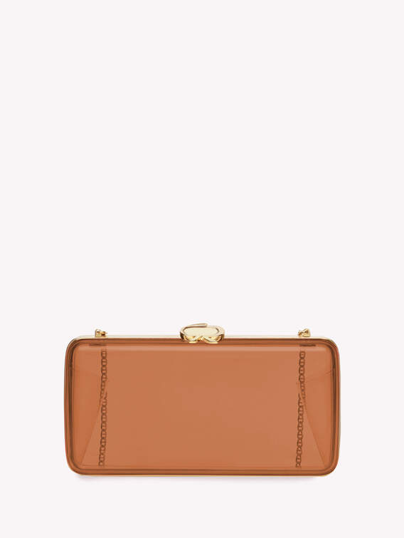 Vetra is an elegant gold framed see-through Plexi clutch with removable shoulder chain. Handmade in Italy. Size: L 22cm x H 11cm x W 4cm